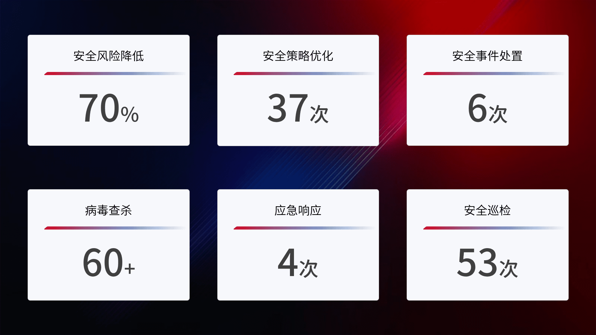 提供全面的安全事件报告体系,,,包括处置报告、、、、周报、、、、季度和年度总结,,,,结合持续监控,,,帮助客户深入了解网络安全状况。。。。